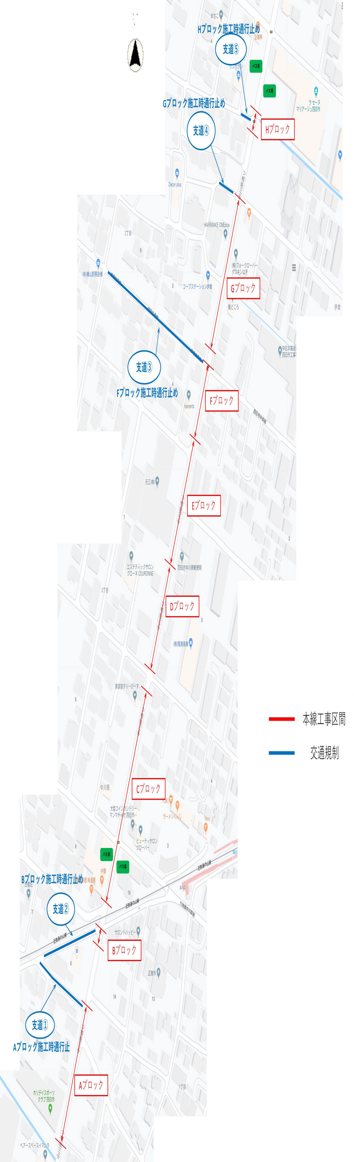 | 2月26日 | 水 | 昼間 | 9時〜17時 | G,H | 下水道等マンホール調整 | 片側交互通行、支道CD通行止め |